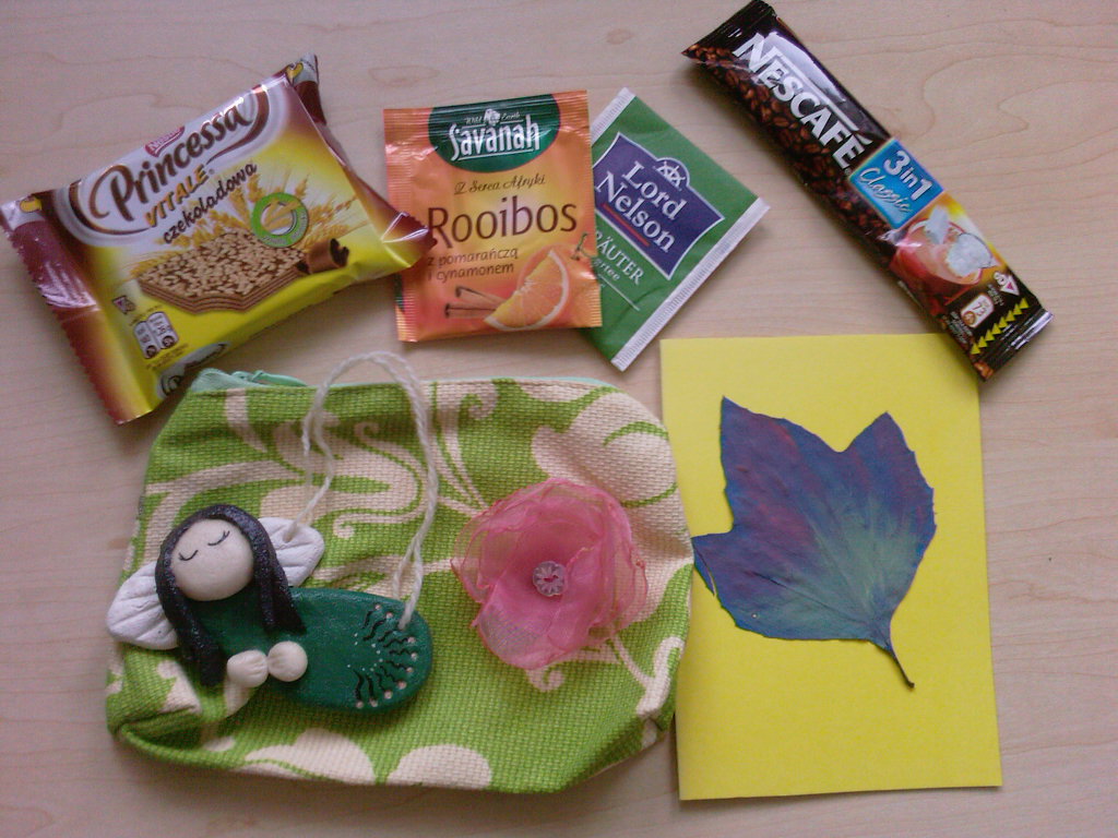 A od Karolinki dostałam: łakocie, kosmetyczkę, aniołka, broszkę i karteczkę: